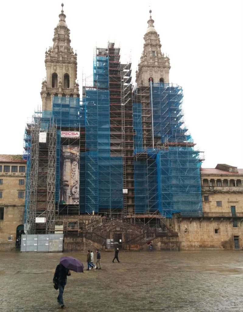 Nach vielen Kilometern (wieviele eigentlich) kommt Michel an einem Aprilwettertag an. Wettermäßig passt das zur ganzen Reise 😉 Und dass der kulturhistorische Höhepunkt – neben dem Muschelhaus in Salamanca – ebenfalls eingerüstet ist, passt auch!
